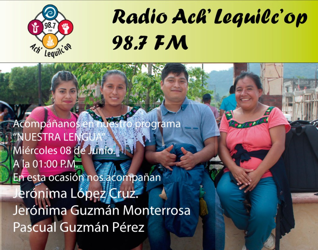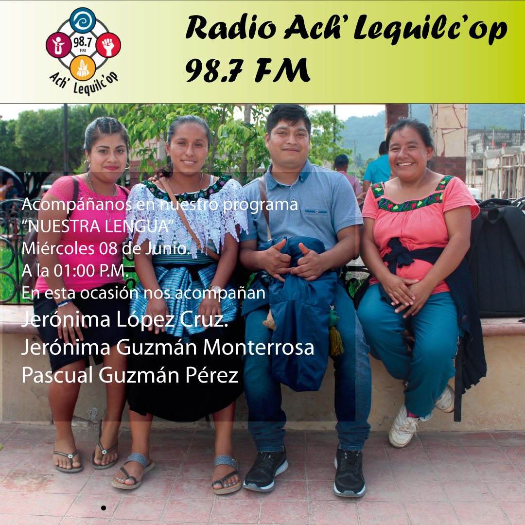 Acompáñanos en nuestro programa NUESTRA LENGUA, donde tendernos la participación de tres compañeras de la cultura Tseltal: Jerónima López Cruz, Jerónima Guzmán Monterrosa, Pascuala Guzmán Pérez y nuestro conductor del programa Gilberto Méndez.