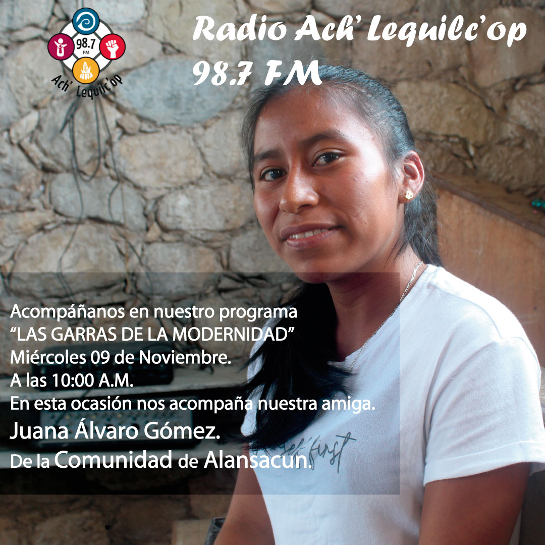 Acompáñanos en nuestro programa «Las Garras de la Modernidad» miércoles 9 de noviembre del 2022, de 10 a 11 de la mañana, en esta ocasión tenemos la participación de nuestra amiga Juana Álvaro Gómez, de la comunidad de Alansacun, que nos platica sobre su vida y experiencia de los cargos que ha tenido.